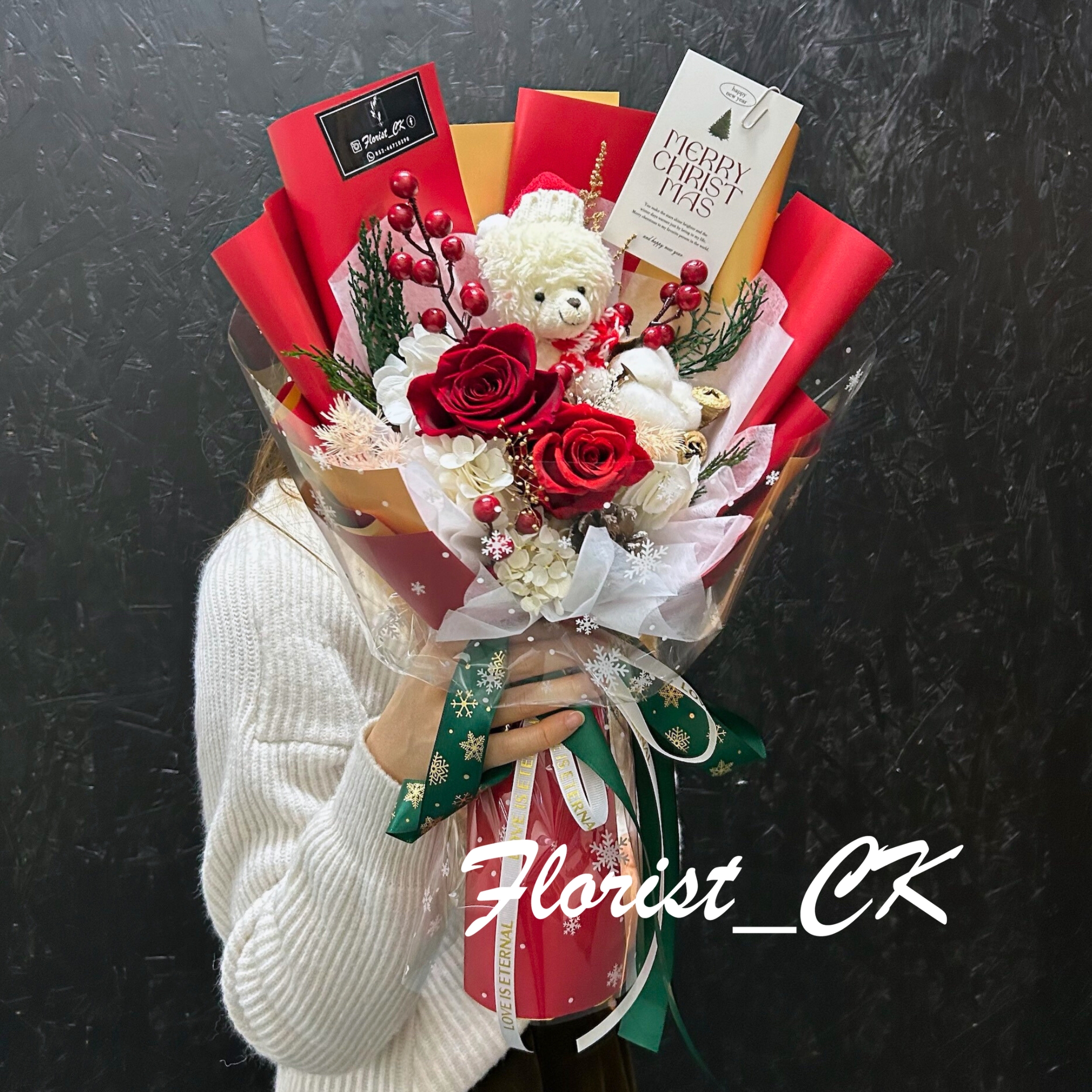 💟送帶有聖誕字句的心意卡(款式隨機送出), LED 燈裝飾,挺身花袋 📣 請提前 3 日預訂,如急單請按右下角 Whatsapp 我們查詢 (不接來電) ✅ 如需代寫心意卡請備註,否則我們會為客人選擇合適的卡片。 ‼️聖誕頭飾隨機送出,數量有限,送完即止。 -------------------------------- 永生花又稱保鮮花 💐 100% 天然真花,經過特殊加工後,花朵可以保留鮮花原有的外貌和質感 🌹 只要保存環境良好,可存放一年或以上 ✅ Tip:不用擔心花束重量,雖然是由鮮花加工而成,但不需要用水養著,所以會很輕身的 ✅