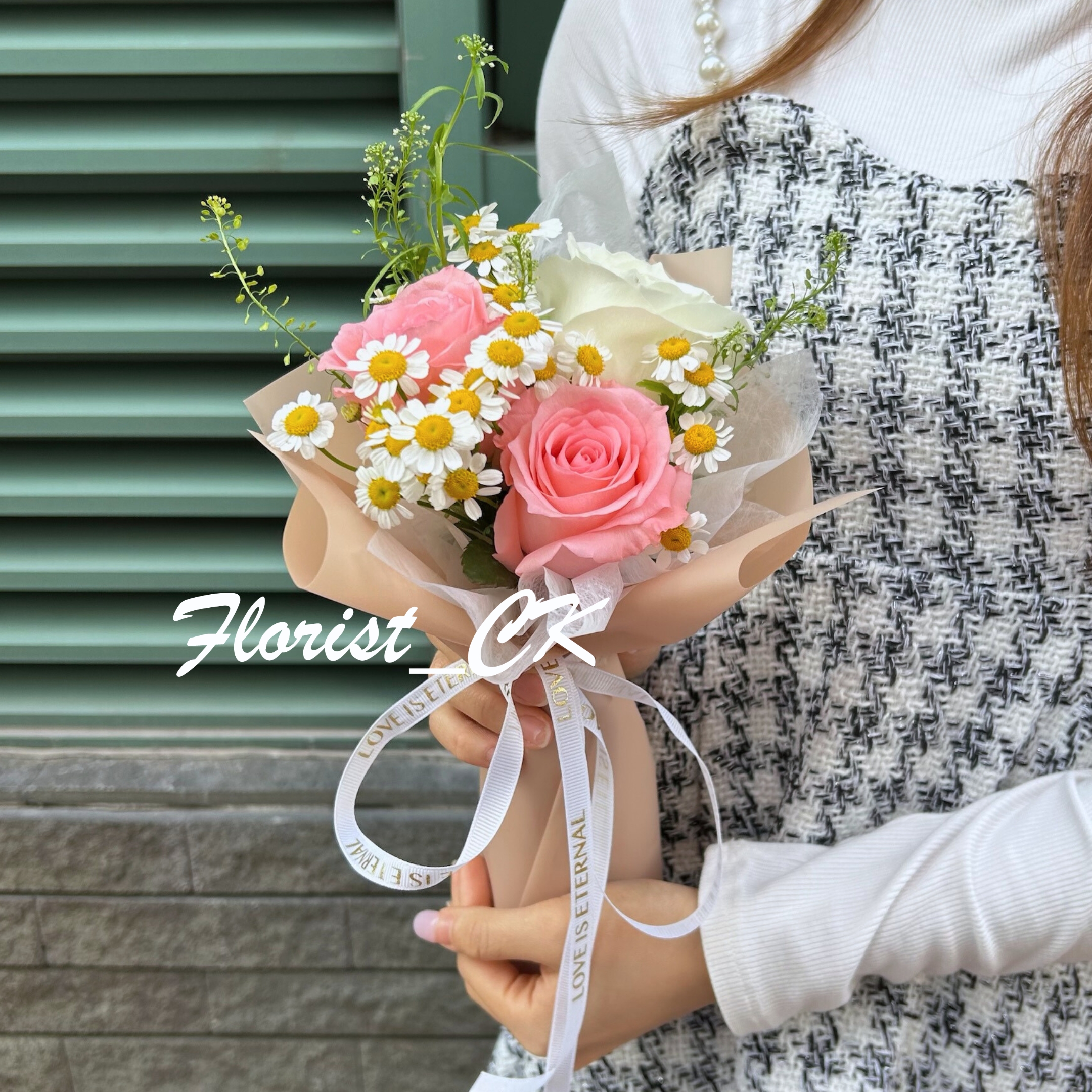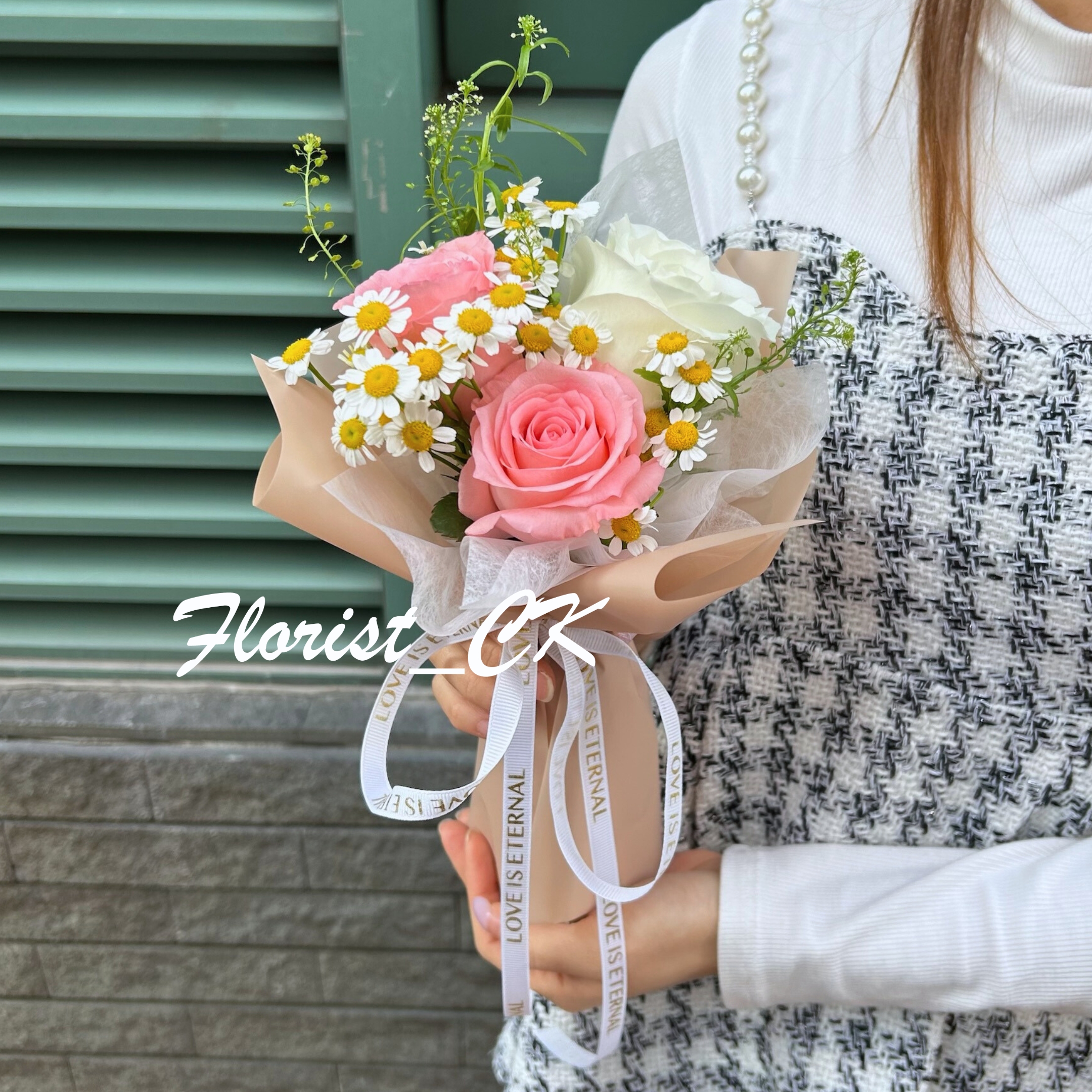 💐 一束小巧而動人的浪漫氣息,柔粉玫瑰與潔白玫瑰相互輝映,襯以滿滿的洋甘菊,彷彿春日清晨的呢喃。細緻的包裝裡藏著溫柔心意,淡淡花香訴說著最真摯的告白。